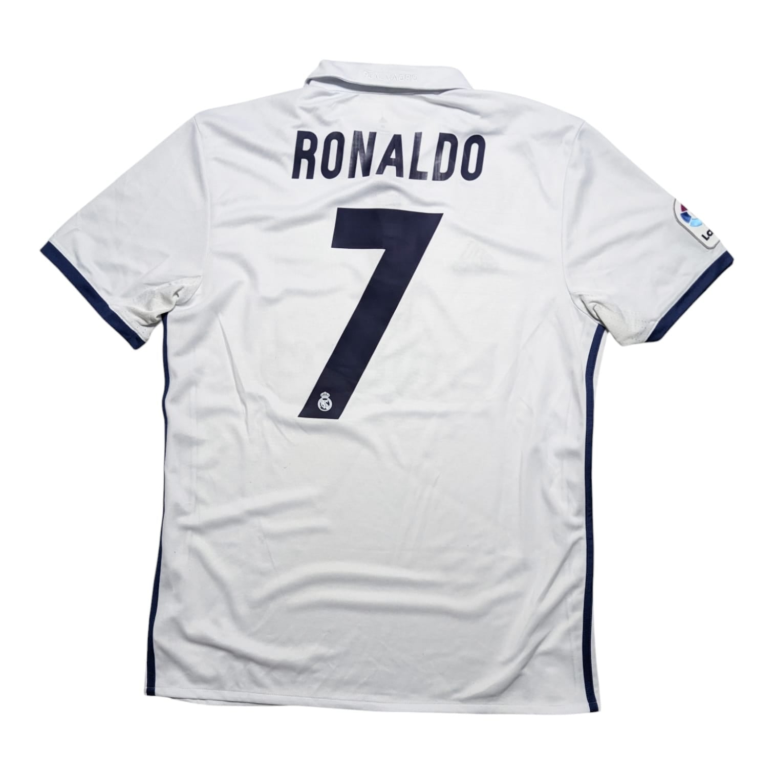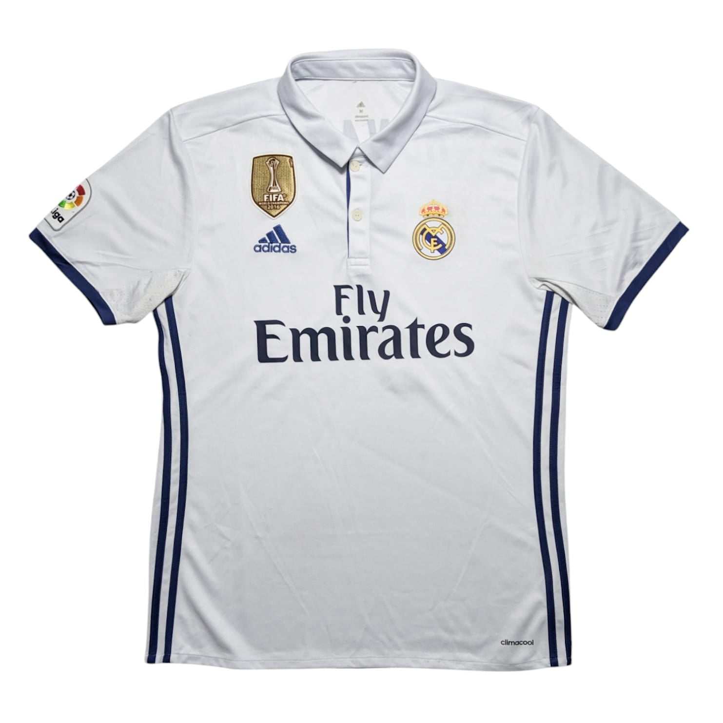 Crafted by Adidas in pure white with refined navy trims, the 2016–17 home shirt symbolizes one of the most dominant seasons in Real Madrid history. Under Zinedine Zidane, the club achieved the impossible — back-to-back Champions League titles, a feat never done before in the modern era.
